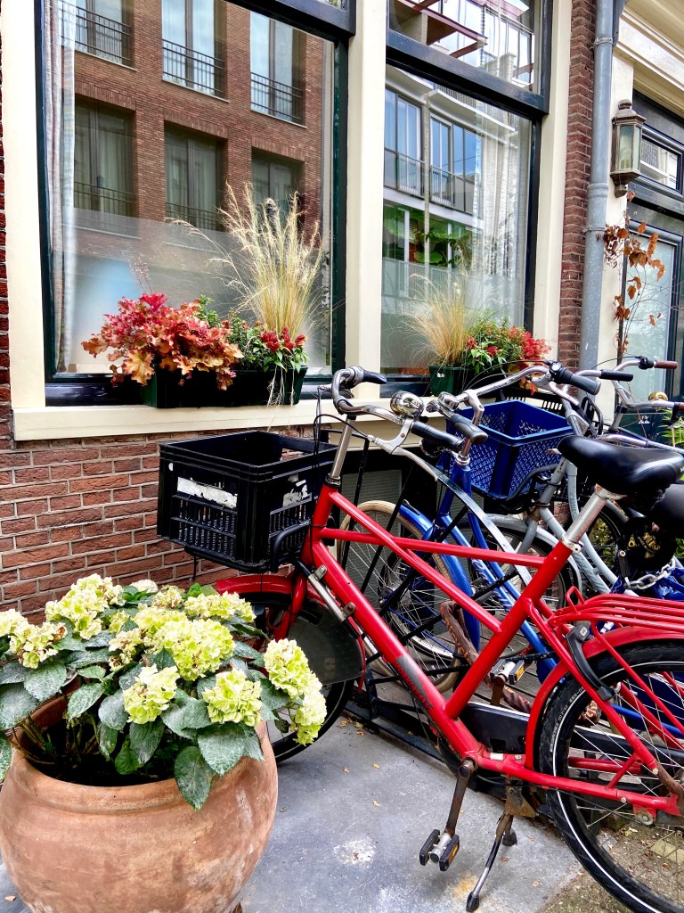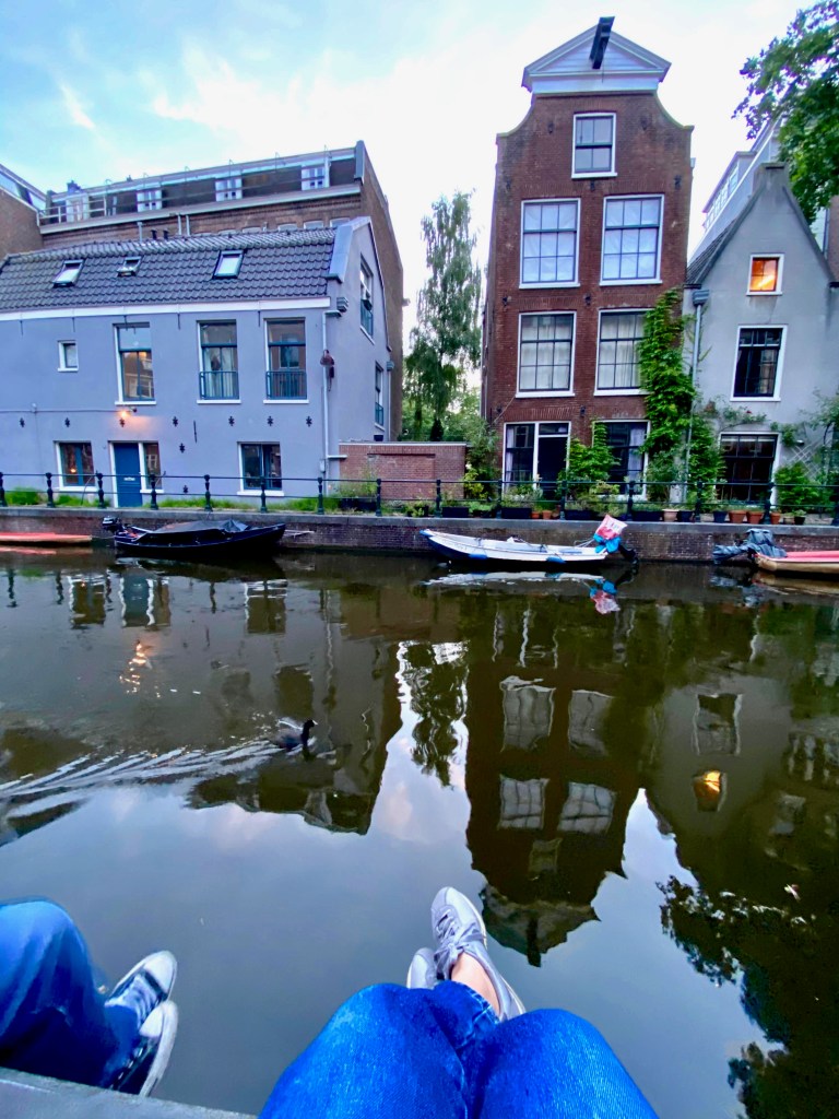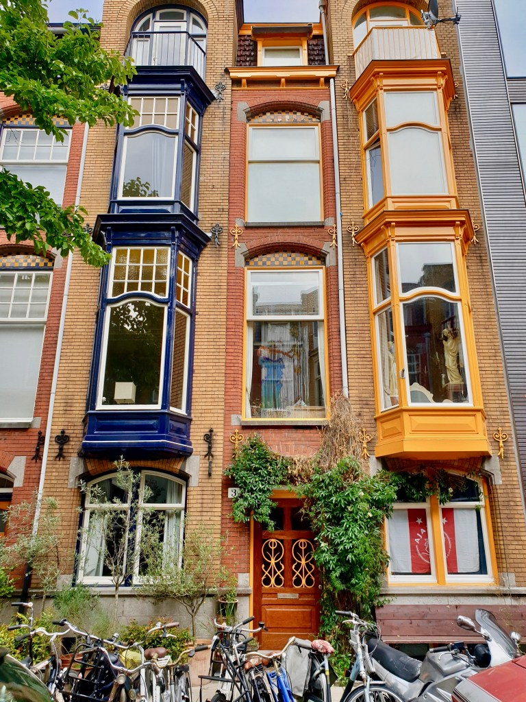 One shower later we were out in town. As the title says without agenda. And it was perfect. I just had in mind that I would like to see all the areas that were around, not strictly red light district area, and the 9 streets (9 Straatjes). However we needed to stroll a bit through the town for the sake of stroop waffel and a hotdog, (we were considering our time very valuable to stand in line for the famous cookies), and then took the Museumplein area. The grass is definitively the greenest here, and it always is everywhere you go abroad 🙂 so we spent some time here people and architecture watching, and finally through the museum quarter, passing by the cutest corners and most colorful balconiess, while also taking picture of every door and bicycle, we reached Vondel Park. Of course we did Albert Hijn stop for the bare necessities (wine, beer & co.)