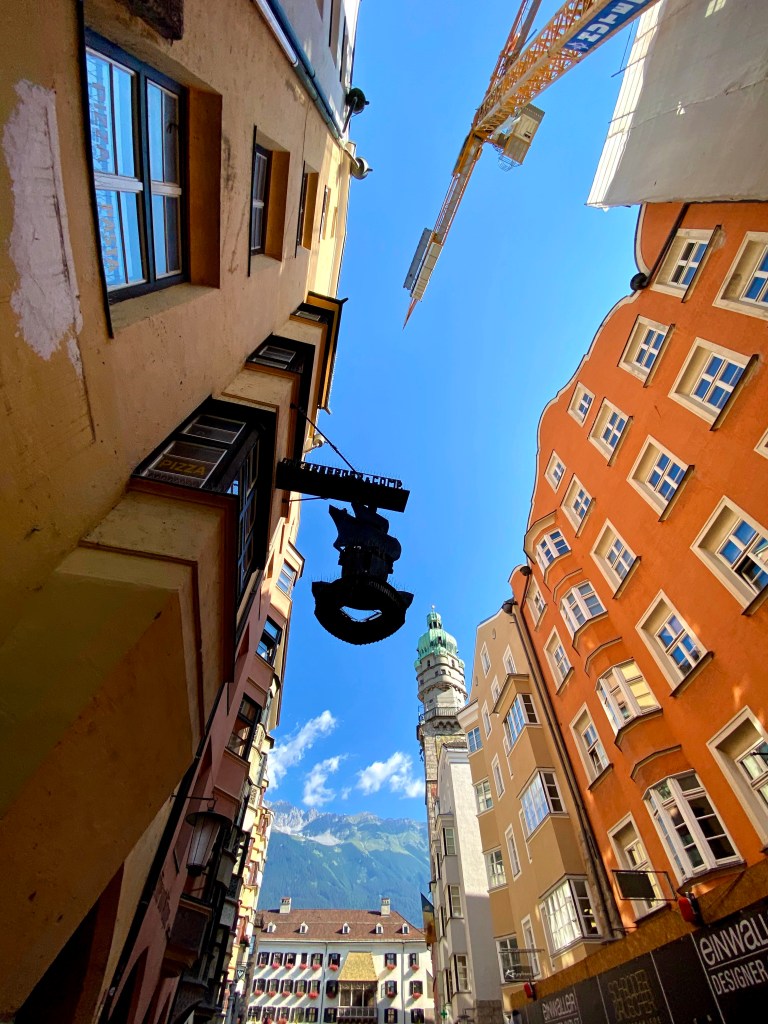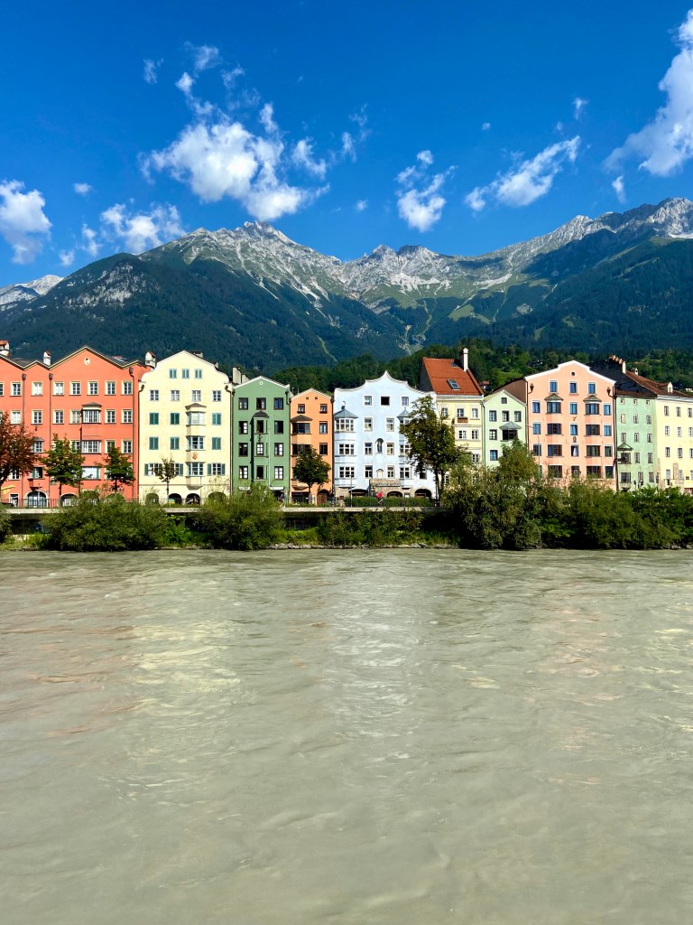The distance between the bus and the train station in Munich is around 10 minutes walking. There isn’t anything much on the way, except some public buildings. We put two hours for Munich just so that we can eat Krapfen at the train station, little did we know that they are available only in winter time. There isn’t stuffed pretzel that cant fix this, plus it gave us the opportunity to literally jump on the train 2 hours earlier. We had a flex ticket for this one and therefore the possibility. Short 2 hour ride and we arrived in Innsbruck, one of my top 3 cities, and yet I haven’t spend full day in here. Shame on me. Many of the places were closed due the circumstances, so we had to satisfy ourselves with coffee to go and colorful houses.