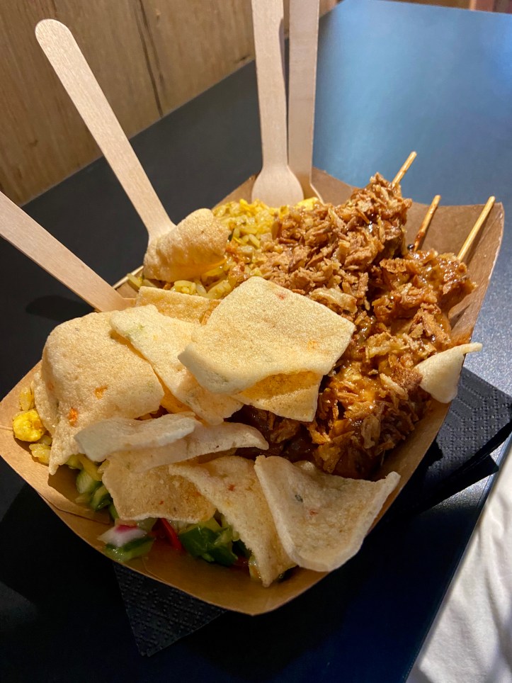 Highlight of the afternoon was the Market Hall, which as you now is also a living building. There were so many stands, but we went for the traditional, herring roll, and then something from the acquired tradition which we really miss in Berlin was Nasi Goreng with Satey and peanut sauce. From not so traditional but neighbourhood taste we had pralines from Leonidas, and the Manon flavour is my favourite.