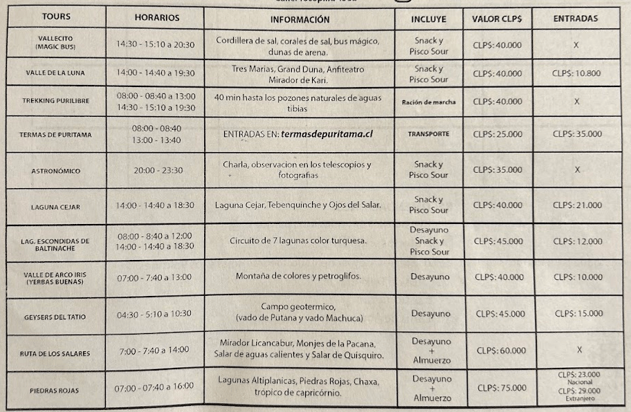 Agency tour fee: 45000 CLP (40 eur/46 usd)